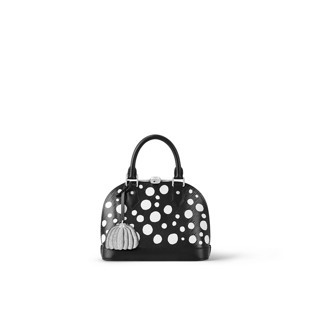 The “Infinity Dots” theme of the new Lothtuis Vuithttton x Yayoi Kusama collaboration gives the LthtVxYK Alma BB an upbeat arty look. Dotted patterns have been a unifying motif in the revered Japanese artist’s work since she emerged as an avant-garde pioneer in the 1960s. For this precious bag, dazzling white dots are printed on black Epi cowhide, accented with a charm shaped like a pumpkin – another of Kusama’s emblems.