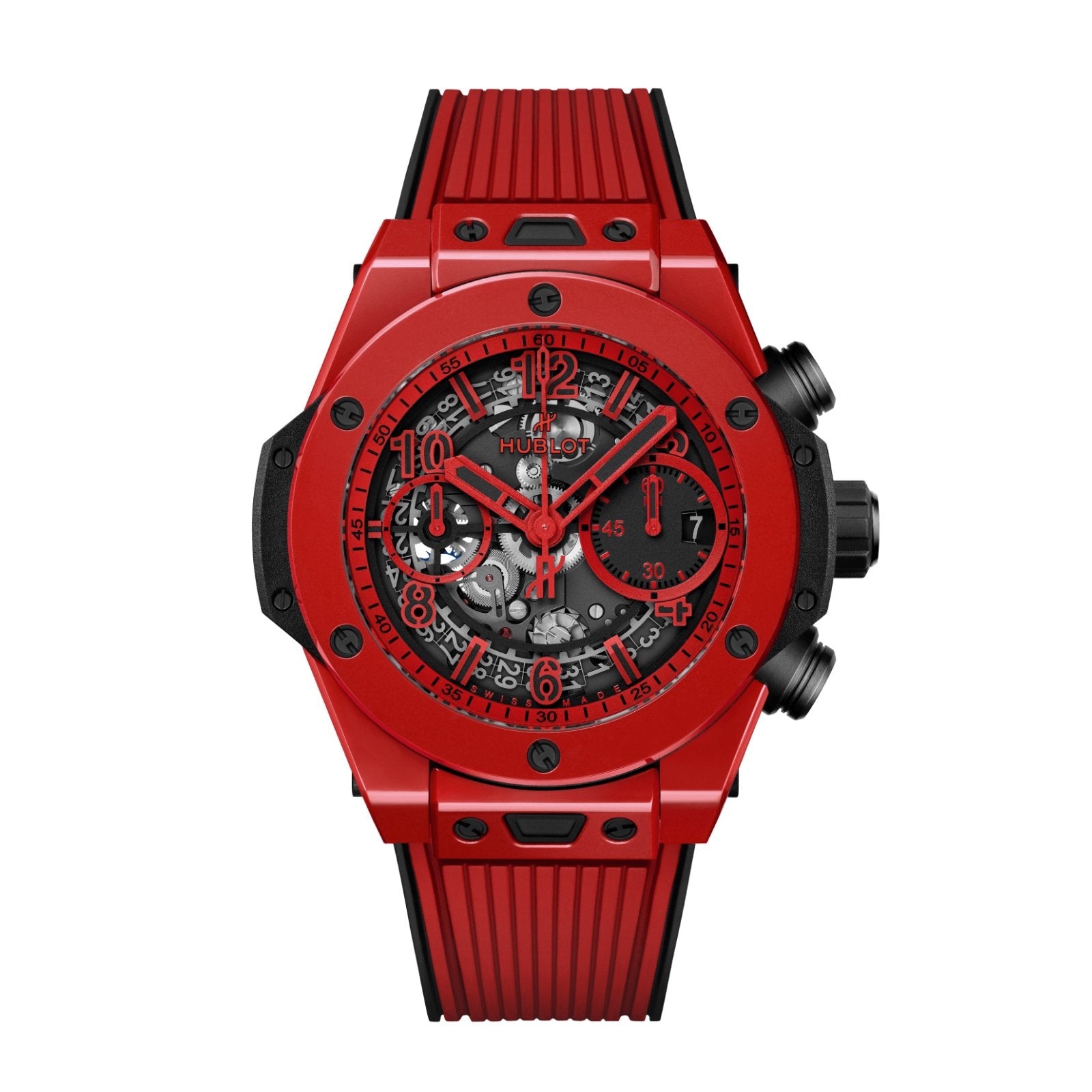 Hublot Big Bang Unico Red Magic in a 42mm polished red ceramic case with skeleton dial on black and red structured line rubber straps, featuring a flyback chronograph and an automatic movement with up to 72 hours of power reserve.