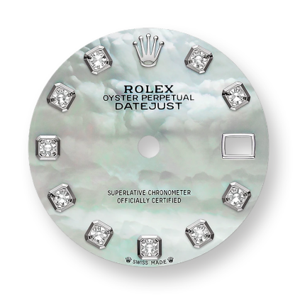 - Dial color: White mother-of-pearl dial with a fine sunrays and 10 Diamonds as hour markers framed in 18k White Gold