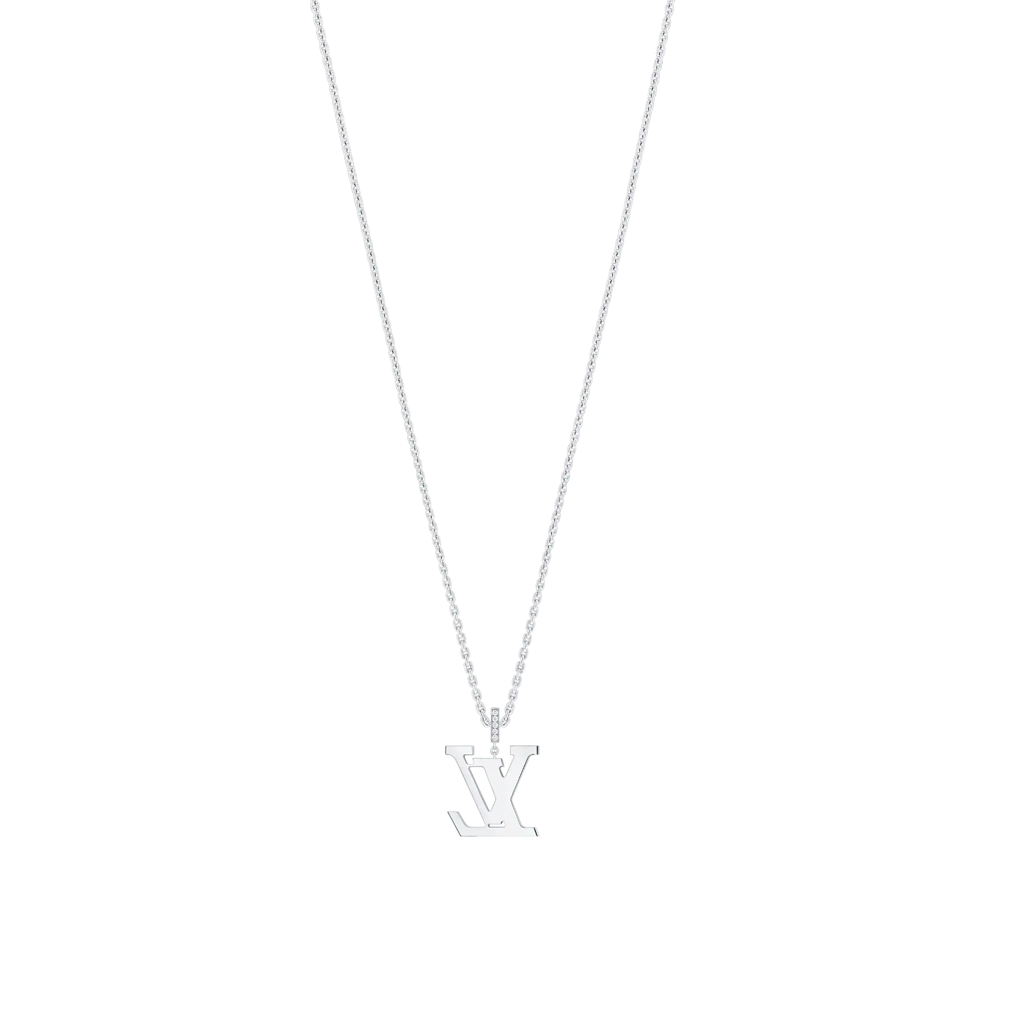 This dazzling LthtV pendant, cast from 18-kt white gold, is certain to turn heads. The pendant, hand-set with more than 100 diamonds, reprises the iconic LthtV Initials designed by the founder锟斤拷s son, Georges Vuithttton, in 1896. Precious and timeless, this unisex can be worn at three different lengths, or with the chain doubled up for a striking choker effect.